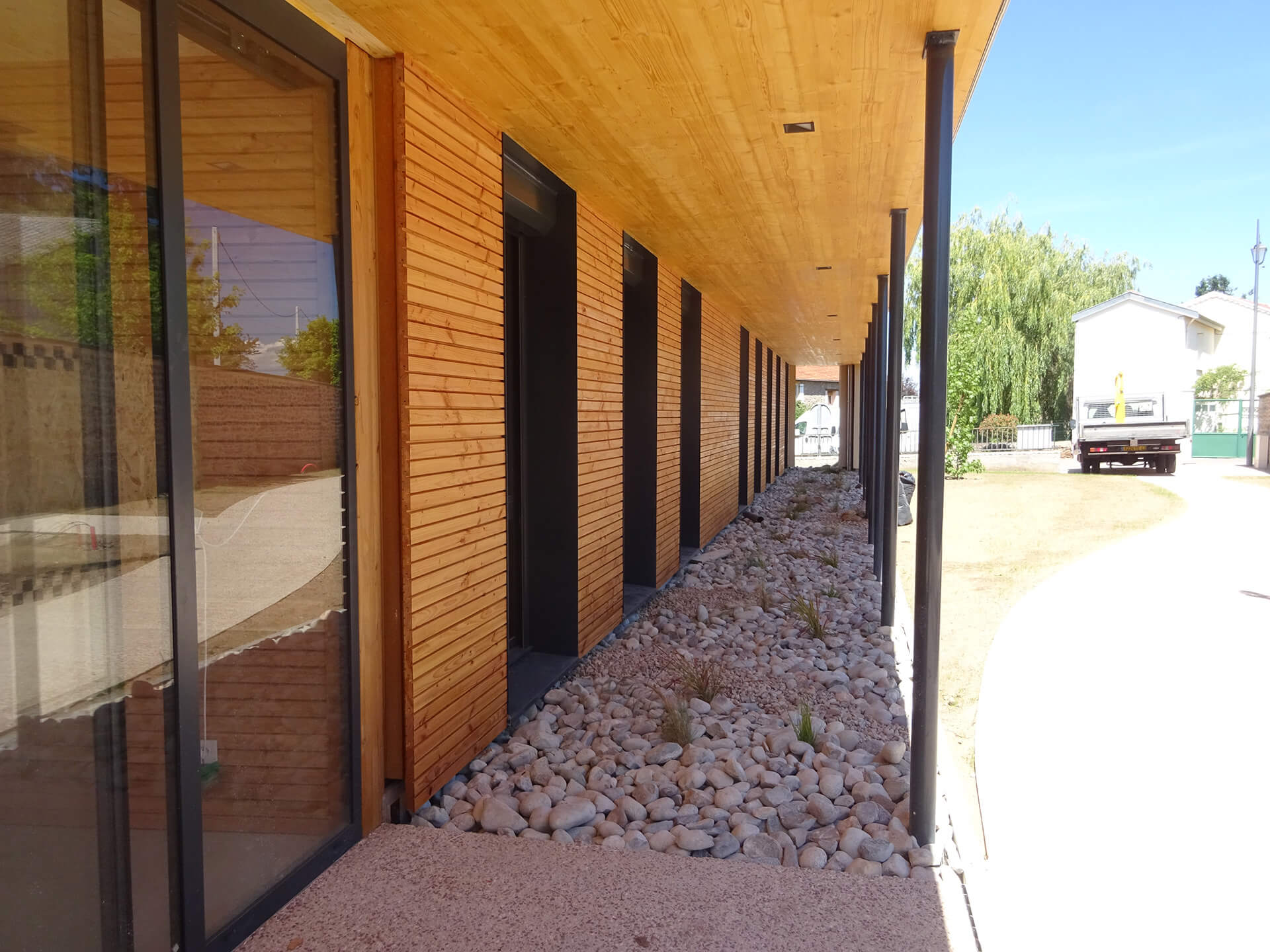 Utilisation importante du bois et optimisation des performances thermiques. Construction en ossature bois avec isolation renforcée. Toiture faible pente végétalisée.